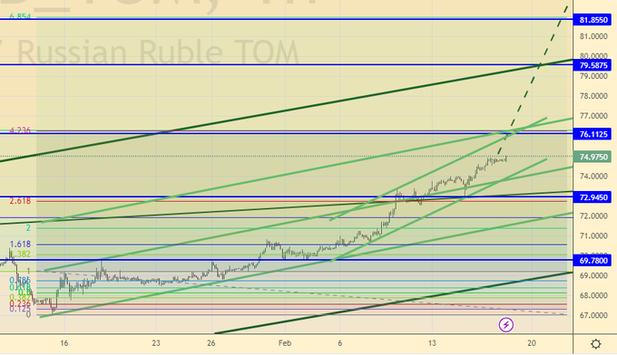 Не видим признаков разворота вниз. Можно было предполагать, что от 74.00 последует откат, однако, вместо этого мы видим продолжение ослабления национальной валюты, что делает ситуацию более нервозной, чем она могла бы быть. Перспективы недобора налогов, и перспективы синтезирования крайне нездоровой ситуации к концу года в банковском секторе из-за санкций могут привести к продолжению ослабления национальной валюты.