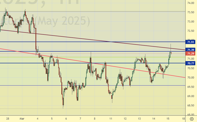 Неплохая позиция для того, чтобы попробовать еще раз продать. Рост выше 72.00 стоит рассматривать как снятие сценария падения цен.