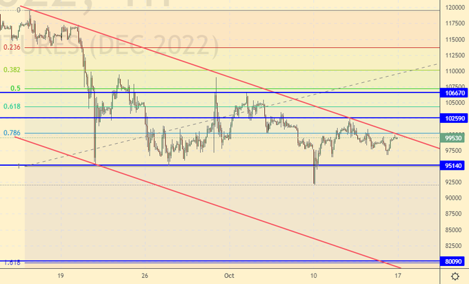 Рост выше 105000 может привести к подъему в район 120000. Следим за новостями. Если Запад начнет уставать от конфликта на Украине, а предпосылки к этому есть, то в случае появления большего количества новостей, о том, что надо садиться за стол переговоров индекс РТС действительно может подрасти. На утро понедельника мы не видим признаков разворота вверх и продолжим придерживаться медвежьих взглядов на ситуацию.