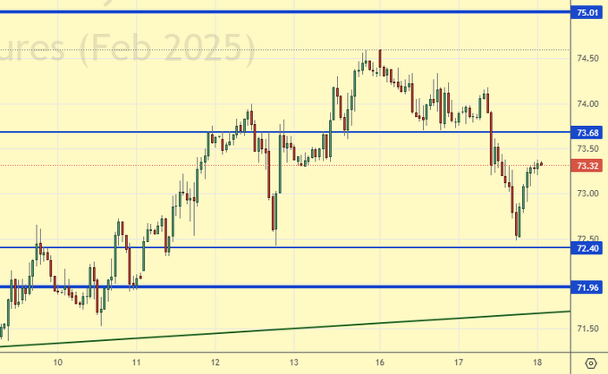 Сегодня вряд ли мы увидим сильные движения до объявления решения по ставке ФРС в 22:00 Мск. Видим, что от 72.50 дважды кто-то большой и сильный откупил рынок. Наверное, это тот самый, кто рассказывает нам через прессу, что цены на нефть упадут в 25-м году. Если вы торгуете с плечом, а это скорее всего так и есть, то вам не стоит уповать только на рассказы дяденек по интернету о том, что «нефти будет много» или «нефти будет мало», стоит все же опираться на график.