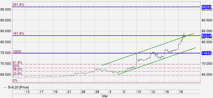 Продажа: возможна при появлении сигналов разворота вниз. Стоп по ситуации. Цель: 76000.