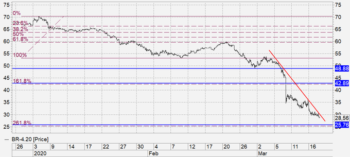 Нефть: продолжаем приближаться к 25.00. В складывающихся обстоятельствах Россия не может диктовать условия, так как объем добычи составляет только 10% от общемирового. Саудовская Аравия плюс последователи способны выставить на рынок до 40 млн. баррелей в сутки. Но, самое интересное заключается в том, что спустя десять дней после того как КСА заявила о скидках и наращивании добычи становится ясно, что 25 долларов это не предел для падения, так как у мира есть перспективы сидеть на карантине аж до двух лет. В таких условиях спрос на бензин и дизель может упасть на 10 – 15%, что приведет к колоссальному затовариванию.