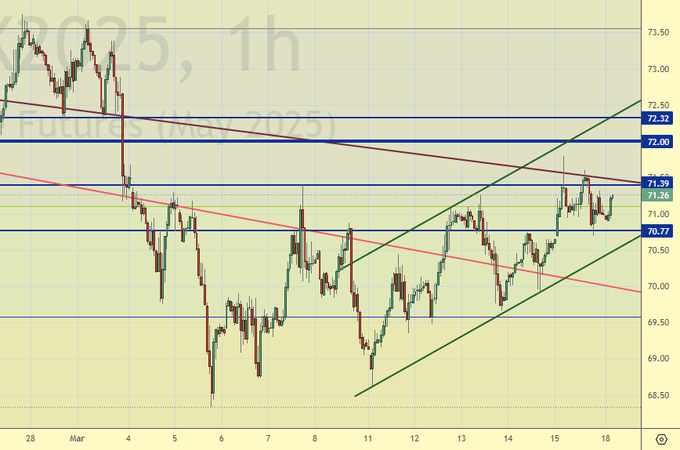 Продажа: при подходе к 72.00. Стоп: 72.60. Цель: 60.00. Кто в позиции от 71.39, перенесите стоп на 72.60. Цель: 60.00.