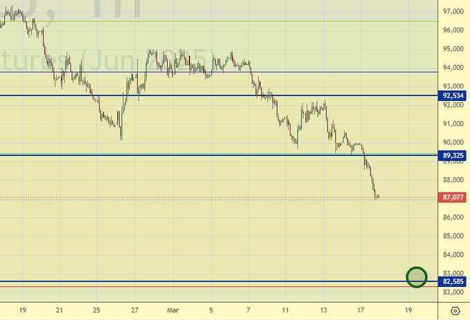 Продолжаем уходить вниз. Это уже сильный перекос в сторону того позитивного, что еще не произошло. Пока политики говорят разговоры, ничего не меняется. А возможно оно и не должно меняться. Мы не знаем. Покупку пары от 83000 можно осуществлять агрессивно.