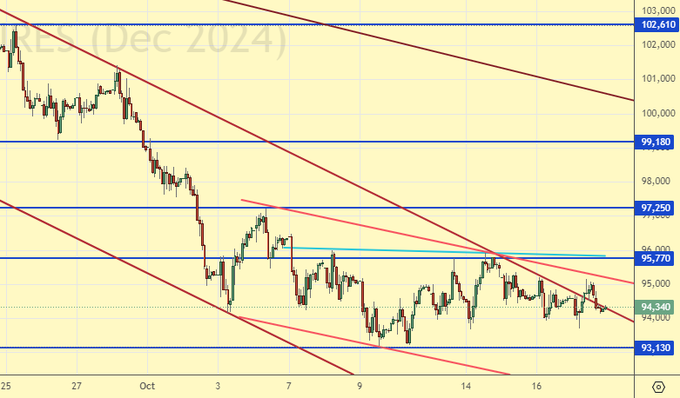 Неспособность пройти выше 96000 может привести к падению 90600 (которого мы и ждем). Пока стоит ставить на данное событие. Обращает на себя внимание плавная проторговка диапазона 93000 – 96000 с тяготением к нижней границе. Если за сегодня быки ничего не покажут, то понедельник может стать черным.