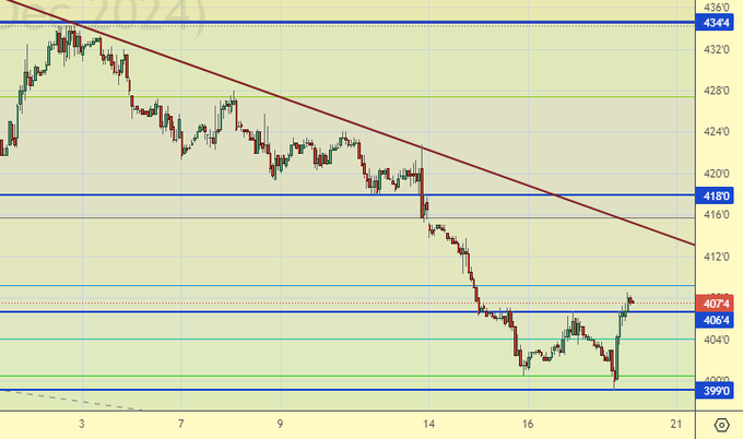 Попытались пройти ниже 400.0. Не получилось. Начали расти. В пятницу будем вне рынка. Ничего интересного по кукурузе пока нет, кроме того что её было много в этом году и будет много в следующем.