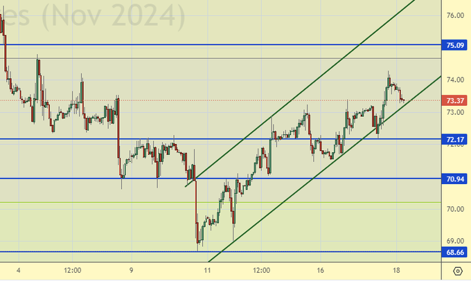 В случае падения ниже 73.00 придется думать о продажах, однако, пока этого не произошло рассчитываем на то, что рынок подойдет ближе к 75.00 для того, чтобы можно было открыть шорт.