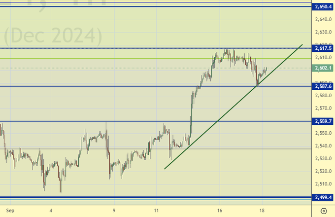 Сегодня заседание ФРС. За сутки ничего не поменялось. По классике, рынок перед важным событием должен уйти из зоны перекупленности (перепроданности). Поэтому, сегодня мы ждем откат, желательно к 2560, после чего рост, скорее всего, будет продолжен.