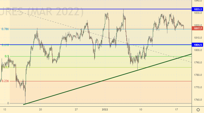 Рынок откровенно ждет заседания ФРС 26-го января, чтобы понервничать и остаться примерно на тех же уровнях. Несмотря на то, что на появились рассуждения о том, что ФРС поднимет ставку в марте сразу на 0.5% пункта рынок золота не спешит приклонять колени.