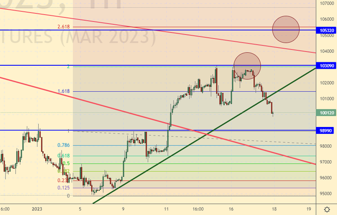 Продажа: нет. Кто в позиции от 102500, перенесите стоп на 102600. Цель: 80000 (50000).