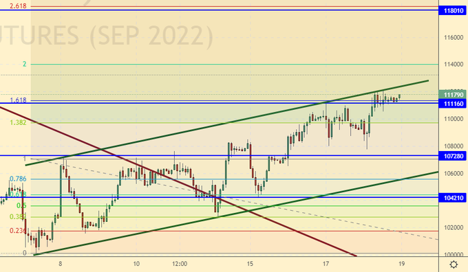 Растем за счет укрепления рубля. Не исключено, что ряд инвесторов начали делать ставку на нормализацию ситуации на Украине, что должно привести к постепенной отмене санкций Запада. Но не всех, какие-то останутся на долгие годы. Если сегодня рынок опустится ниже 110900, то можно продавать.