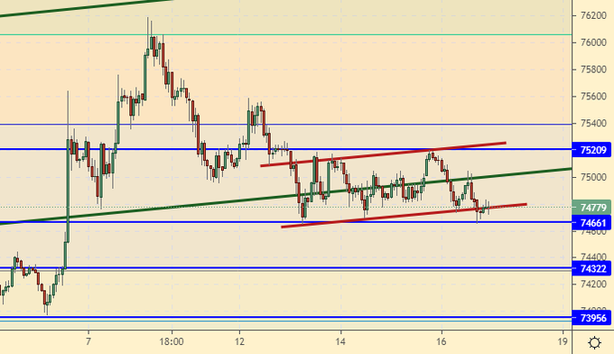 Продажа: сейчас. Стоп: 75100. Цель: 74100.