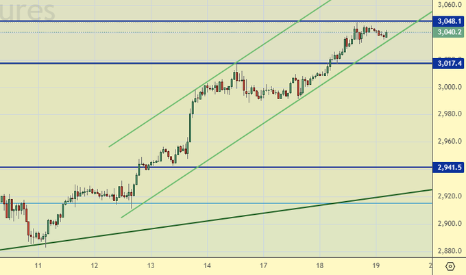 Разорвали 3020 и ушли выше. Этот шаг в целом открыл дорогу к 3300. Стоит подождать хода выше 3050, после чего потребуется откат снова к 3020, от которого можно будет купить. А пока можно продолжать держать шорты.