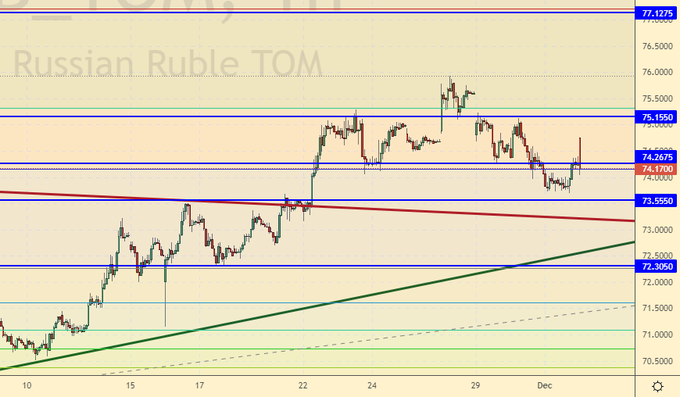 Пара не смогла пройти ниже 73.50, что создает предпосылки для продолжения бычьего тренда по доллару. Вряд ли кто-то до 15-го декабря (заседание ФРС) будет делать ставки на ослабление позиций американской валюты. Если сегодня ОПЕК не предпримет действий на сокращение предложения на рынке, то рубль окажется под давлением.