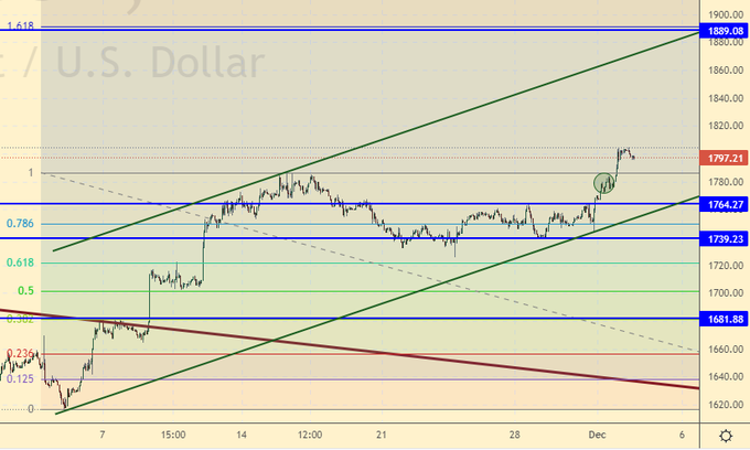 Действительно, золото не останавливается. Ход на 1890 просматривается. В текущей ситуации любые откаты вниз можно использовать для увеличения покупок. Входить в лонг можно вплоть до 1750. ФРС поднимет ставку 14-го декабря, но на данный факт может быть уже никто не будет обращать внимание.