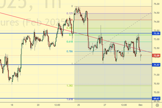 Продажа: при возврате к 72.50. Стоп: 73.50. Цель: 69.70.