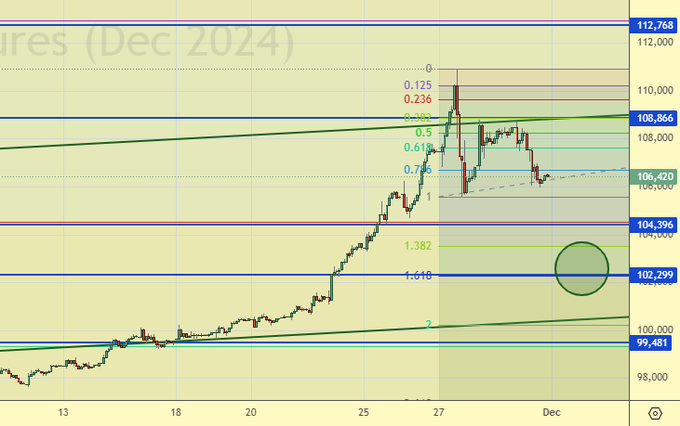 Есть некоторая недосказанность в текущей коррекции после роста. Нужна еще одна ветка вниз, хотя бы к 104500 (лучше глубже). Но как она будет отрисована с текущих уровней или после подъема к 110000 не ясно.
