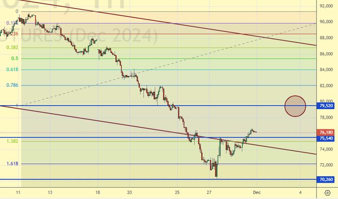 Ждем рост к 80000. Там можно будет попытаться продать. Более высокое восстановление рынка должно быть подкреплено политической нормализацией, но об этом говорить на данный момент невозможно.