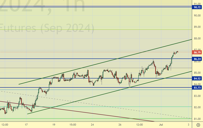 Покупка: нет. Кто в позиции от 85.39, перенесите стоп на 84.90. Цель: 99.90.