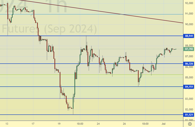 Продажа: нет. Кто в позиции от 89000, держите стоп на 88200. Цель: 75000.