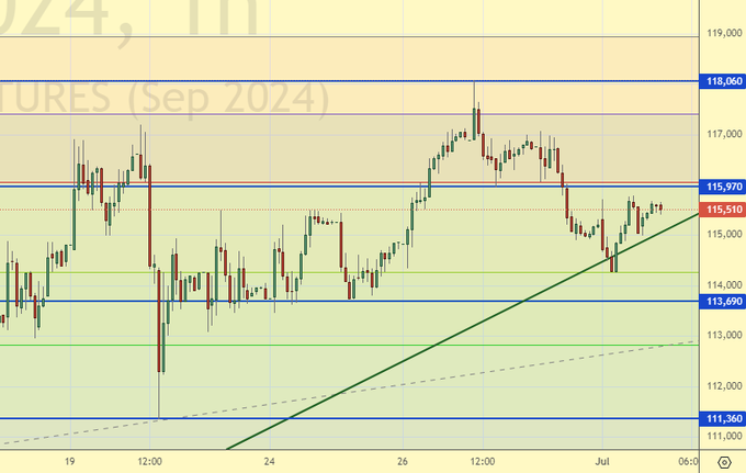 Если рынок закрепится под 116000, то это может привести к ходу в район 113000. Идеальной была бы продажа от 116700, но этот уровень рынок может нам не дать. В целом, вызывает большие сомнения рост российских активов в долларах США, однако, в момент перекоса(такой как сейчас) это может произойти.