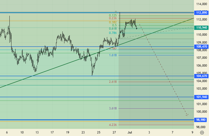Продажа: возможна. Кто в позиции от 111410, держите стоп на 112700. Цель: 95000.