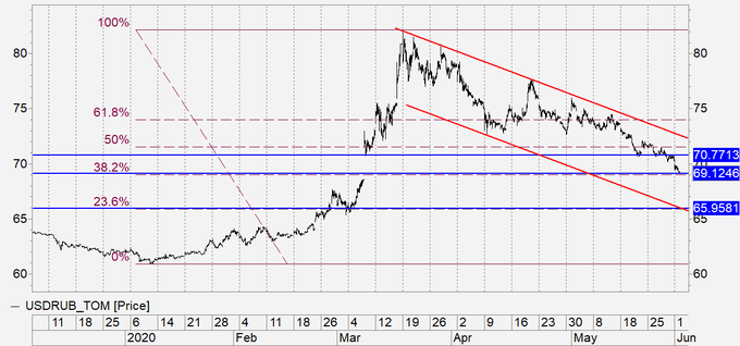 Рубль вчера укреплялся на фоне растущей нефти и нового витка бардака в стране — гегемоне. Мы практически пришли к 69.00, дальнейшее укрепление зависит от того возьмут ли цены на нефть уровень 40.00. Все внимание на встречу ОПЕК+. Если меду Москвой и Эр-Риядом случится новый акт любви, то увидим 43.80 по Brent, что приведет пару на 67.00, где мы и рекомендуем покупать доллар, при условии, что в США к этому времени останется хотя бы один целый магазин.