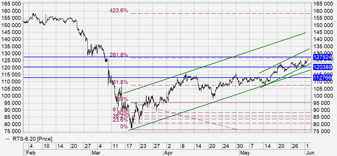 Подошли к району 127500, здесь можно искать возможности для продажи. Рынок акций всё больше становится искусственным. Рост в текущих обстоятельствах объясняется только скупкой банками бумаг, так как реальный сектор кредитовать сейчас бессмысленно. Поэтому, рывку к 150000 не удивимся. Таким образом, при шортах от 127500 соблюдаем технику безопасности, ставим стоп-ордера, считаем риски.