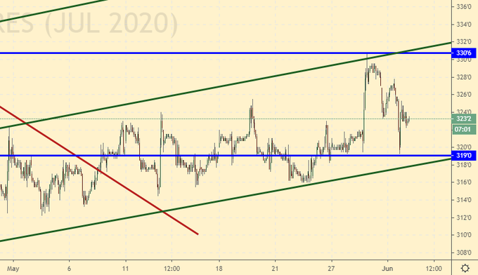 Ждем от рынка хода к 542.0. Для более сильного роста нужна плохая погода, нашествие саранчи на Европу, логистические проблемы или, наоборот, повышенный спрос на белый хлеб фоне радости по поводу окончания пандемии. Пока ни один из данных факторов не проявил себя, цены будут стараться расти, но не факт, что это удастся, так как быки с ужасом будут ждать данных о новом урожае. Очередной отчет USDA не за горами, он выйдет 11 июня.