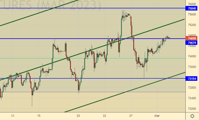 Продажа: сейчас и при подходе к 75.50. Стоп: 76.40. Цель: 70.00.