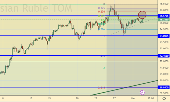 Если мы отсюда не падаем, то нам предстоит пройтись вверх к 80.00. Не хотелось бы чтобы ослабление валюты носило безостановочный характер. Это плохо повлияет на восприятие реальности. К 80.00 нам надо быть к концу года, а не к 8 марта. Будем продавать на текущих уровнях.