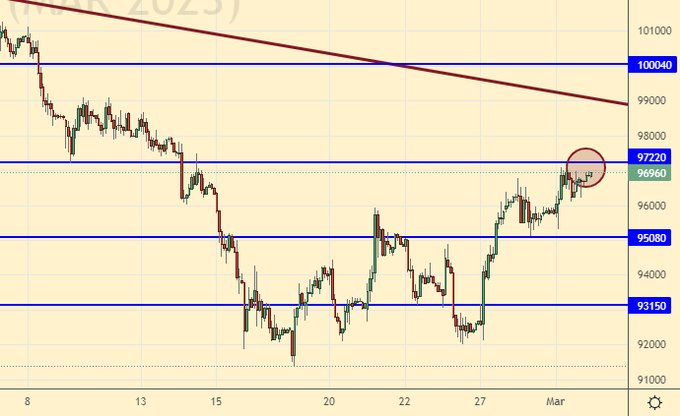 Продолжим рекомендовать шорты. Движение вверх не отрицаем. Если не получится зацепиться за продажи от 97000 будем это делать от 100000. Политическая камарилья суетится, пытаясь как-то снизить накал текущей конфронтации, но пока это не получается. Любые позитивные подвижки будут хорошо приняты рынком, осталось их дождаться.
