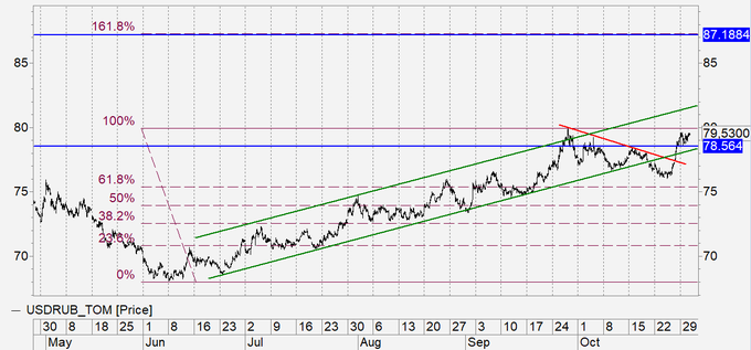 Вряд ли рубль до объявления результатов выборов в США преодолеет уровень 80.00. Исходя из этого, ждем вязкой борьбы следующие два дня в диапазоне 79.00 – 80.00. В случае победы Трампа, скорее всего, получим откат к 75.00, это надо учитывать.