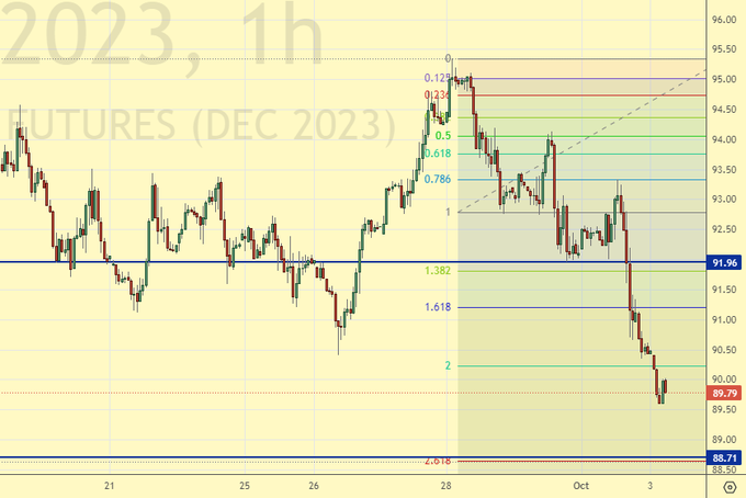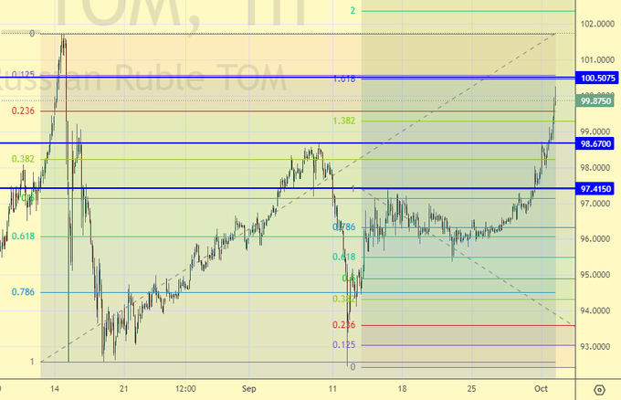 Да… Нет… Ну, что же… Мы подошли к 100.00, если не вмешается ЦБ, то мы скорее всего пройдем выше данного уровня и остановимся на 101.00, там будет небольшая борьба, которая поклонникам рубля так ничего и не даст. Для раздутого бюджета 24-го года надо чтобы бочка нефти стоила 10000 рублей, а лучше 15000. Пока вне рынка.