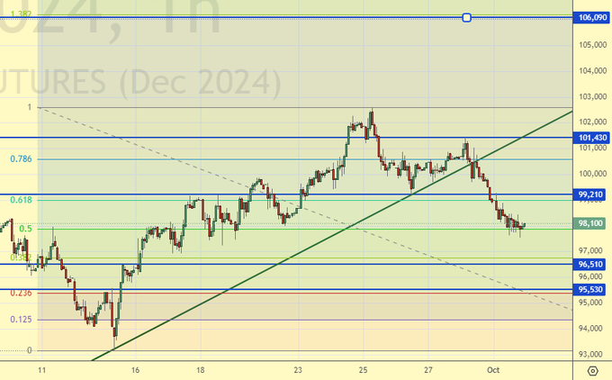 Продажа: нет. Кто в позиции от 100610 и 100360, перенесите стоп на 100300. Цель: 90600.