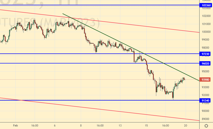 Не отрицаем возможности восстановления до 97200. Более сильный рост вряд ли возможен. Много на этой неделе будет зависеть от выступления Президента РФ 21-го числа. Если в послании будут заложена нота о наращивании усилий в оборонной сфере, то этот посыл может быть воспринят рынком негативно.
