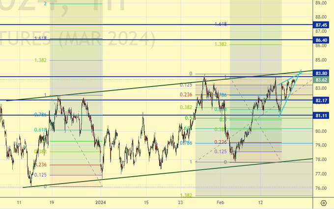 Смотрится рубль так себе. Мы продолжаем находиться в растущем канале, что может привести нас к более высоким уровням. Расходы на СВО явно существенные, что отрицательно скажется на бюджете, который придется как-то выправлять в том числе и за счет ослабления курса рубля. Да поможет нам высокая нефть.