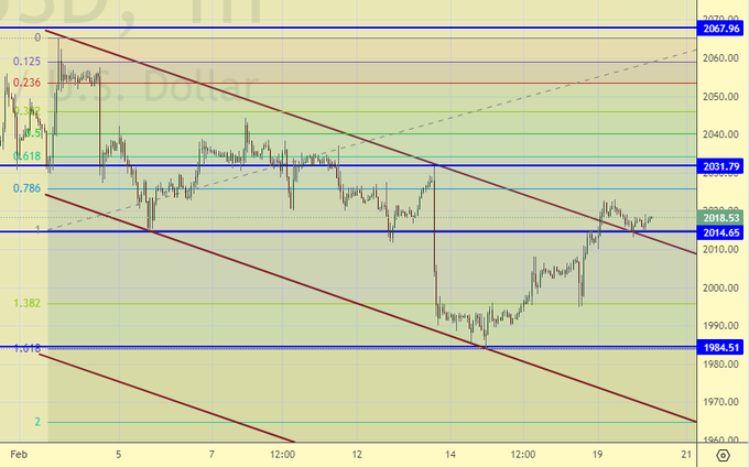 На фоне праздников прорыв вверх падающего канала выглядит несколько провокационно. Мы продолжаем держать шорт со стоп-ордером на 2024 в расчете на продолжение падения. Размышления о дальнейшем росте процентной ставки в США могут перерасти в ожидания трейдеров. Это поддержит американскую валюту, в том числе и против золота.