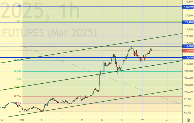 Несмотря на то, что Европа ввела 16-й пакет санкций, рынок на это никак не отреагировал. Дистанцирование от ЕС уже в цене. Будет хорошо – хорошо, а не будет, значит придут купят нефть и газ и уйдут. Не забываем отмечать, что рост рынка начиная с конца ноября был существенным – 53% (от 75000 до 115000), что подразумевает коррекцию.