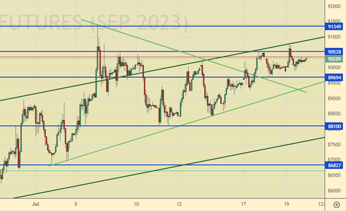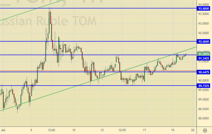 Продавцы пока не могут предложить рынку каких-либо идей. Рынок не может закрепиться ниже 90.00 для того, чтобы сформировать сопротивление, оттолкнуться от него и пойти вниз. Шансы на достижение отметки 100.00 в августе выросли. После допуска к торгам банков из дружественных стран (44 страны), возможно в августе, на рынке могут произойти изменения. Если Россия начнет активнее продавать свои товары за рубли, это может позитивно сказаться на курсе рубля на горизонте 3 – 6 месяцев. Однако, первоначальное движение будет направлено скорее всего против национальной валюты.