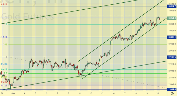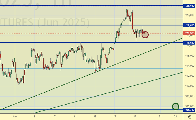 Американский мастер над монетой (Пауэлл) отметил рост риска инфляции от действий Трампа. Ставку оставили. Будут следить к каким последствиям приведет торговая война. Ресурсов у США много, а надо будет больше – напечатают. Вопрос в том, когда начнут. Скорее всего, когда станет ясно, что китайского рабочего победить нельзя, он и за полцены свой товар продаст. Никакие пошлины не помогут американцам выправить торговый баланс. Выход выше 1.0950 откроет дорогу к 1.1100.