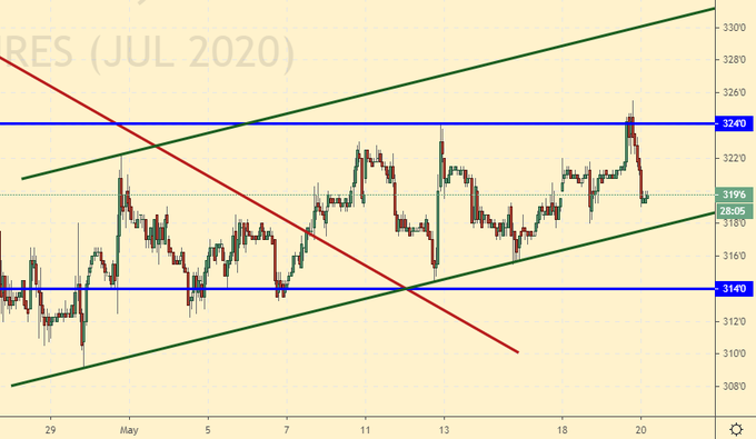 Участники рынка попытались вчера вовлечь в покупку толпу, устроив штурм уровня 325.0, но из данной затеи ничего не вышло, и мы остались в диапазоне. Рост цен на кормовые ограничивают перспективы снижения потребления мясной продукции. Не исключено, что в этом году спрос на кукурузу упадет существенно, что в перспективе увеличит по итогам сезона конечные запасы.