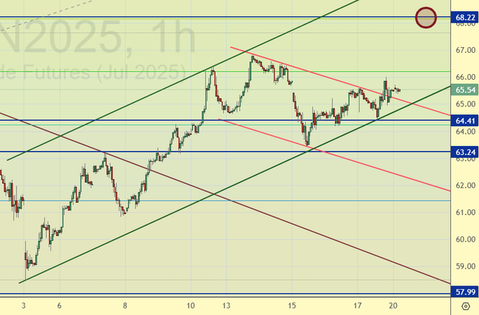 Продажа: при подходе к 68.20. Стоп: 69.20. Цель: 55.00. Кто в позиции от 66.00, перенесите стоп на 66.30. Цель: 55.00.