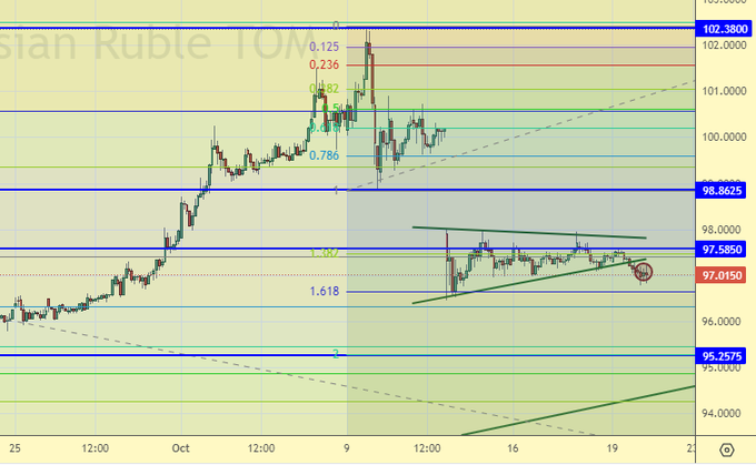Вышли из консолидации вниз, однако это не гарантирует нам немедленного укрепления, тем не менее, будем отрабатывать технический сигнал. Отметим, что рубль получит дополнительный импульс на укрепление в случае позитивной динамики в противостоянии с Западом.