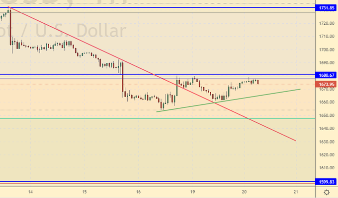 Золото нарисовало нам технически значимые ценовые ветки, подготовив почву для дальнейшего падения. Ждем заседания ФРС в среду, ждем уровень 1600.