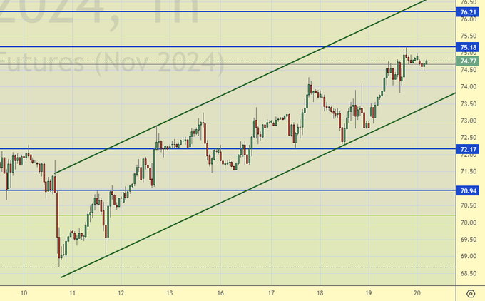 Ураган в Мексиканском заливе ослаб. Рабочие вернулись на платформы. Добыча возобновилась почти в полном объеме. Не работает только 16 платформ из 370. Вот видите, нам пора снова попробовать припасть. Как и ожидалось, цены пришли в район 75.00, что создает комфортные условия для входа в шорт. Для успеха предприятия нам надо чтобы снова начались вопли и стоны по умирающему Китаю, который, к слову, реально стал сокращать покупки нефти из России. Но мы это выдаем как часть сделки с ОПЕК. Выглядит кошерно. Как бы наш колосс не подломился. Там народу… что они все делать будут?