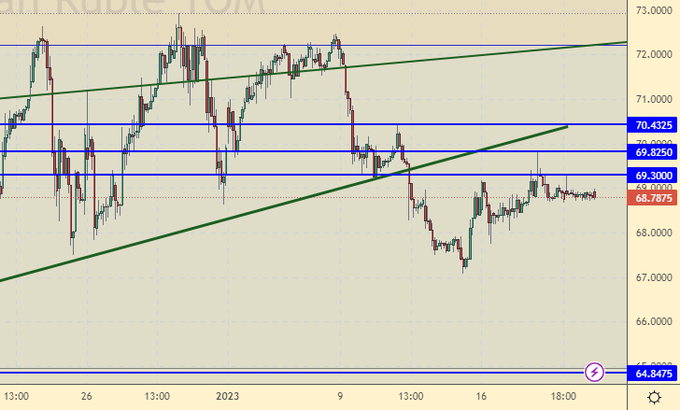 Пока вероятность укрепления к 65.00 остается. Отметим, что если падения не произойдет до 25-го января, то мы можем и не увидеть его, так как закончится налоговый период. Страхи по поводу дефицита бюджета и разгону инфляции остаются, так как при сокращении поступлений рост расходов на оборону будет только расти.