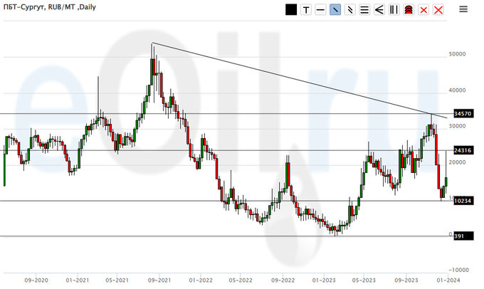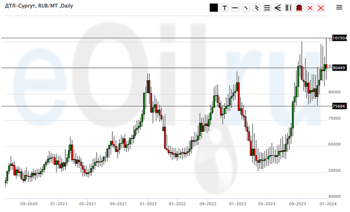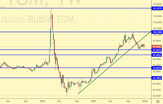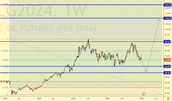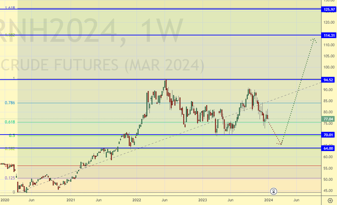 Цены на нефть марки Brent могут попробовать пройти к 120.00 на каком-то ужасе, возьмут и пробьют хуситы баржу в Красном море, например. С другой стороны, если в США к власти придет человек озабоченный зеленой повесткой, то рынку нефти уровень 50.00 будет казаться голубой мечтой, как бы это у вас в голове не прозвучало. При относительно спокойном сценарии развития событий мы будем тяготеть к уровню 75.00 долларов за баррель нефти марки Brent.
