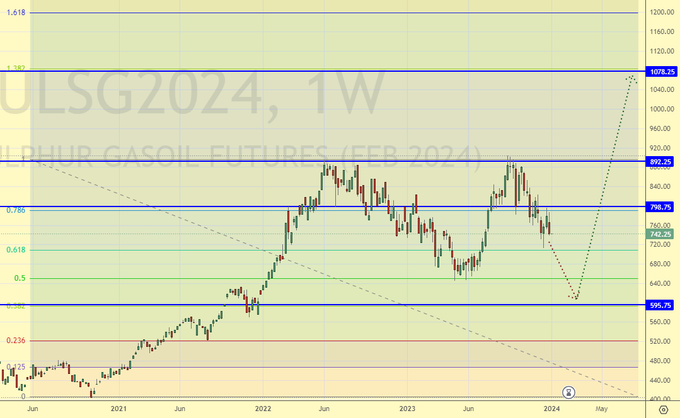 Сценарий роста: перешли на февральский фьючерс, дата экспирации 12 февраля. Спрос на топливо будет оставаться высоким. Однако, для хорошего входа нам нужно падение к 600.0.