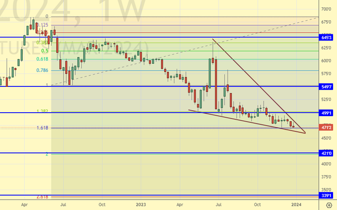 Сценарий роста: перешли на мартовский фьючерс, дата экспирации 14 марта. Кукурза снова загрустила. Если будет пробита поддержка на 470.0, то мы отправимся к 425.0.